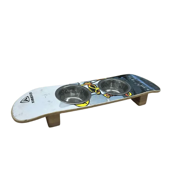 Chaque pièce est unique : les couleurs et marques du skateboard donnent à ce bar à chat un caractère singulier. Conçu pour un usage quotidien, il offre une solution pratique et stable pour les repas de votre compagnon, tout en valorisant une démarche de réemploi.
